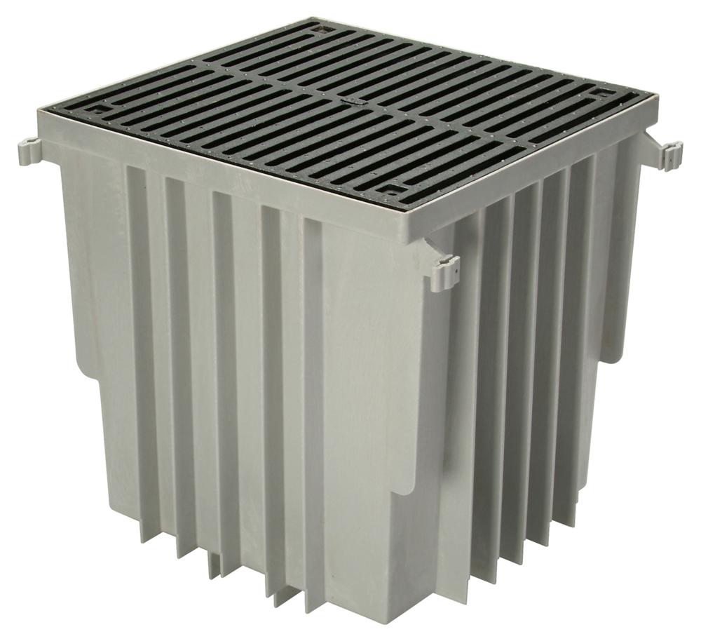 Zurn Z887 catch basin, 24" x 24". High density polyethylene reinforced body, complete with interlocking ends, combination tie-down / leveling devices, integral frame and heavy-duty, dura-coated cast iron grate.